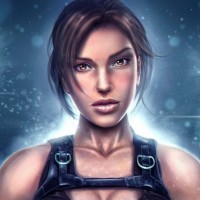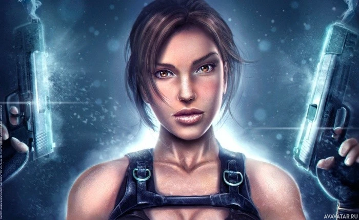 The image shows a stylized, digital representation of Lara Croft, a well-known