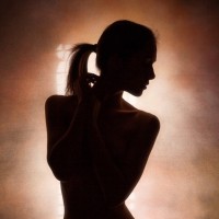 На картине изображен силуэт девушки с рукой на плече и груди. Она стоит перед тем, что кажется теплым, золотым источником света. Ее форма тела и осанка предполагают, что она может позировать с художественной или фотографической целью. Основное внимание уделяется форме и контурам ее фигуры на контрастном фоне.