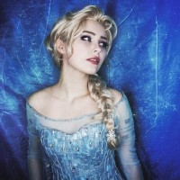 The image features a person dressed in costume as Elsa, a character from an animated movie. This cosplay portrayal captures the essence of Elsa's iconic style with her ice powers and ethereal hair.