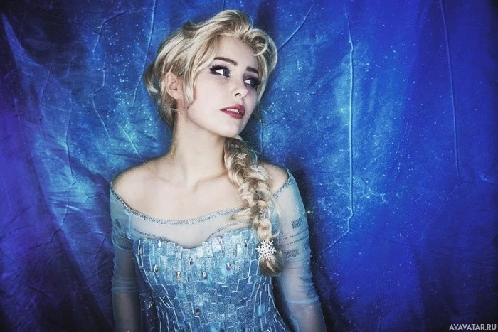 На картинке изображен человек, одетый в костюм Эльзы, персонажа из анимационного фильма. Это косплейное изображение отражает суть культового стиля Эльзы с ее ледяными силами и эфирными волосами.