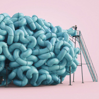 complex structure, there's a tall ladder leading up to a platform, suggesting an analogy with exploration or understanding of the brain. To the right, there is a small construction crane or cherry picker, which could imply the idea of delving deeper into the brain, much like one might dig for clues or insights into complex phenomena. The image does not contain any visible text and is stylized to resemble a realistic