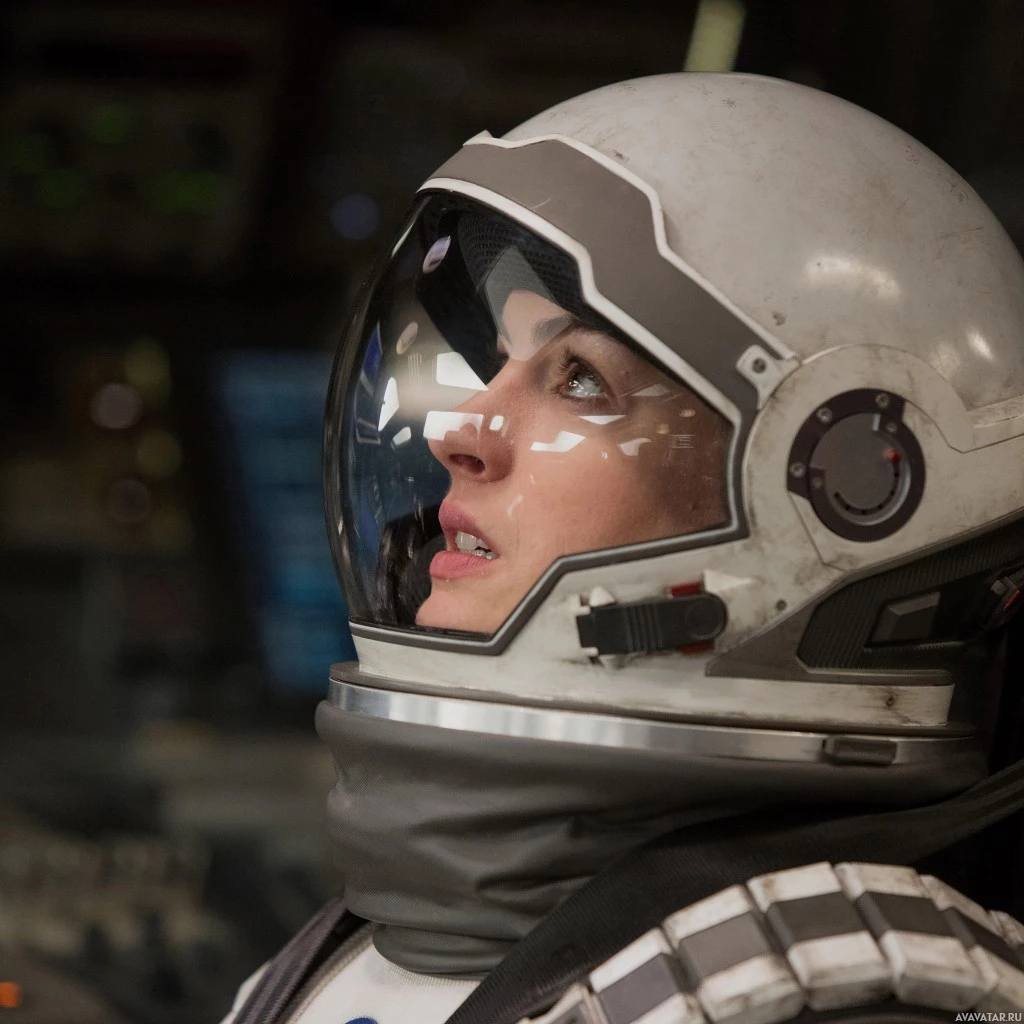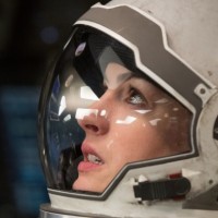 a spacecraft cockpit. She is wearing a spacesuit with the helmet off, revealing her face and upper body. Her expression seems contemplative or focused, looking out towards something not visible in the picture. The setting suggests a movie or a realistic depiction of an astronaut's environment during a mission, given the presence of