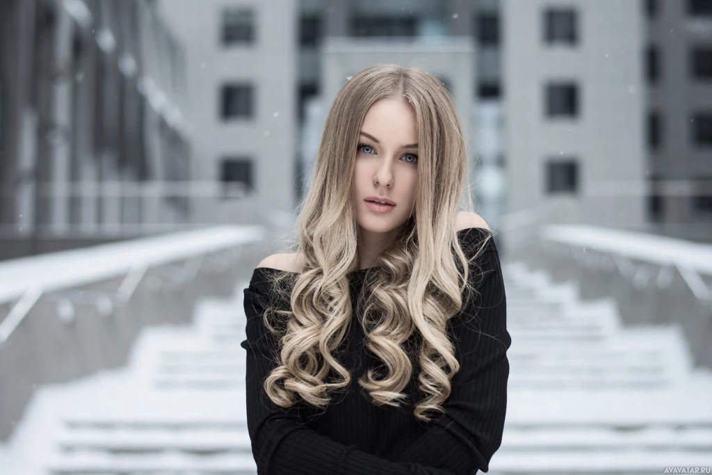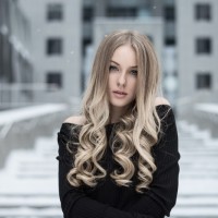 blonde hair. She appears to be outdoors, possibly during winter given her attire and