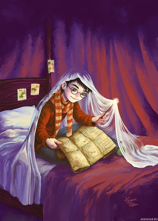 the Harry Potter series. It features a character named Harry Potter, who is recognizable by his lightning-shaped scarf and glasses. He is sitting on a bed in what appears to be his dormitory at