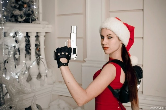 holiday character, Santa Claus. In her hand, she holds a pistol, which appears to be a staged prop or a replica for