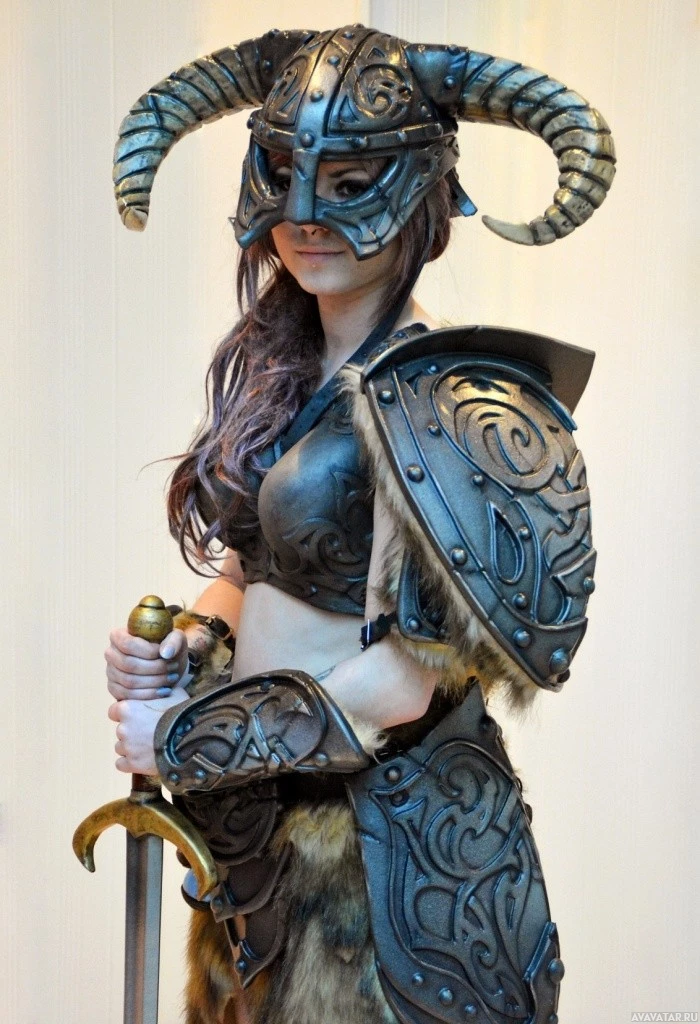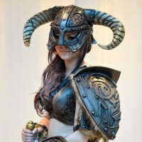 video games, specifically as the armor style for a character like Lydia or a similar warrior-type character from the game. The individual is also holding what looks like a sword in one hand and is wearing fur on the shoulders, which adds to