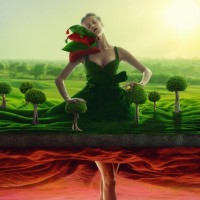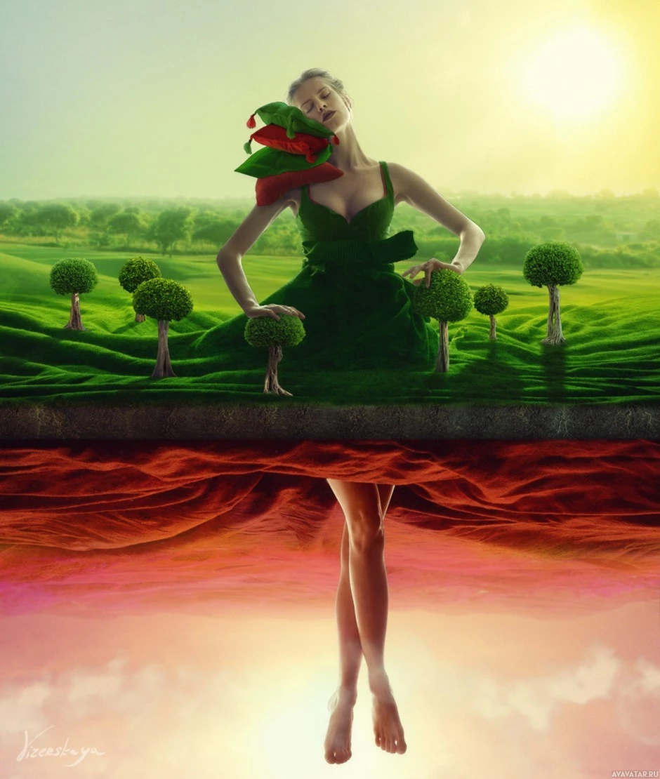 a fantastical scene with a woman lying on the ground and her legs appear to be sprouting from the earth in a surreal manner. Above her, a bright sky suggests