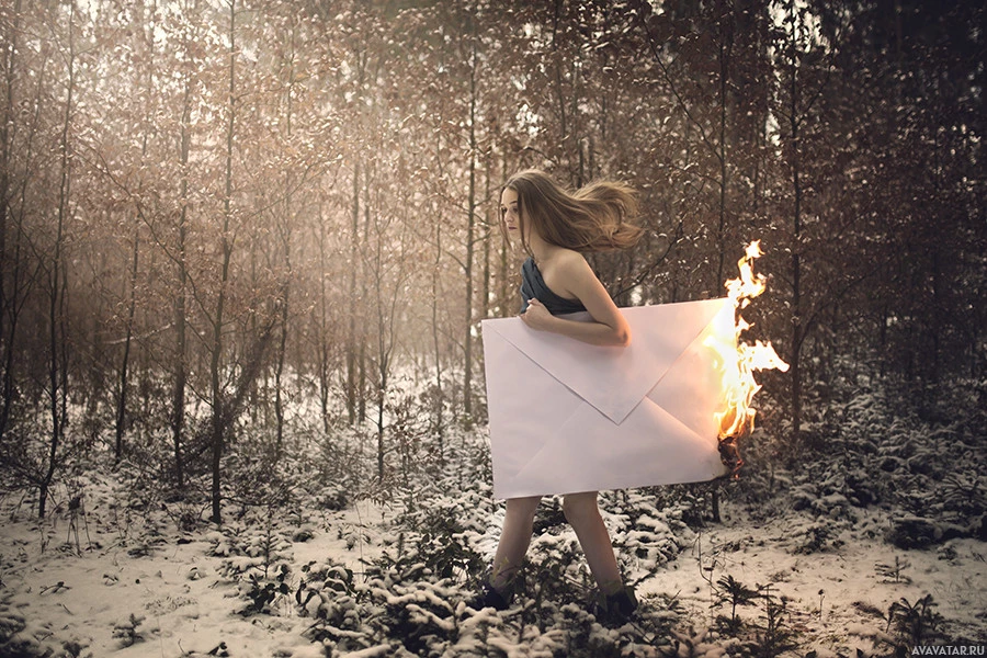 trail of flames seems to be following behind her, which suggests that she may have been burning something or that there might be a controlled fire nearby. The girl's hair is blowing in the wind, indicating movement and adding a dynamic element to the scene. She is looking towards the viewer with