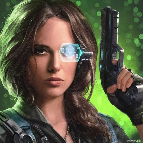 На картинке изображена женщина, держащая пистолет. Она также носит какие-то головные уборы или очки с цифровыми дисплеями на них, что говорит о том, что она может быть из научной фантастики или футуристической обстановки. Ее выражение серьезное и сосредоточенное, что указывает на то, что она может быть в середине сцены действия или готовиться к битве.