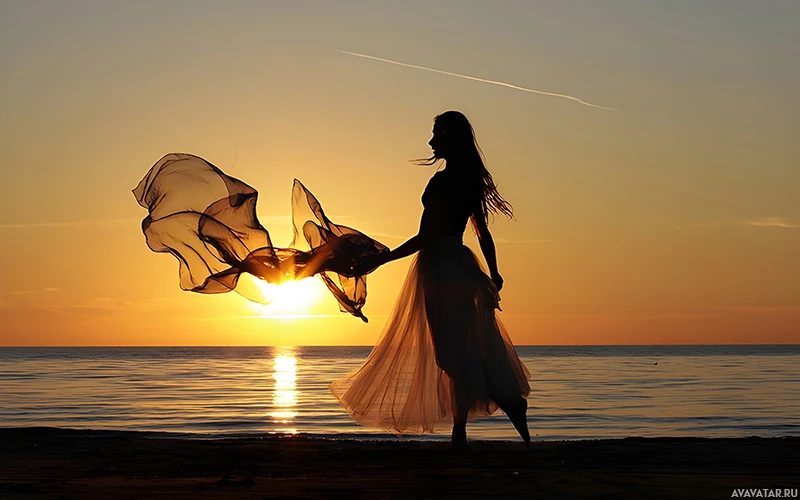 the warm colors in the sky. Her hands are extended upwards and slightly apart, as if reaching for something unseen or simply stretching after