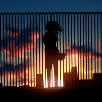 a silhouette of a person standing against a backdrop that appears to be a sunset with hues of orange, pink, and purple in the sky. There are also structures visible, which might be buildings or part of a fence, contributing to an urban or industrial setting. The figure seems to be looking out towards the cityscape, possibly contemplating the scene.