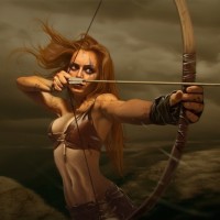 a dramatic sky that suggests either dawn or dusk. The focus of the image is on her as she prepares to release the arrow, which seems to be the central theme of the composition.
