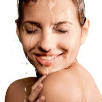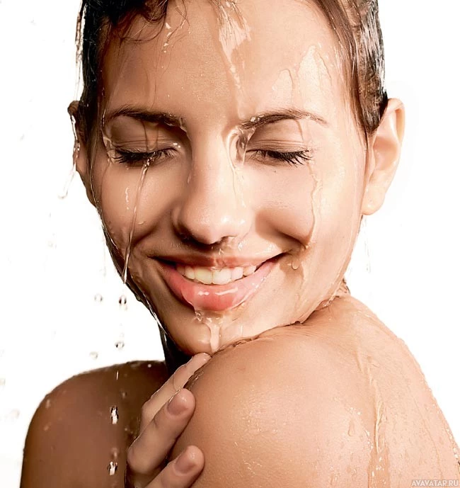 a young woman with wet hair and face, smiling as she looks upwards. She appears to be in the process of washing her face or enjoying a shower. Her eyes are closed, suggesting relaxation or enjoyment. The background is minimalistic, providing a clear