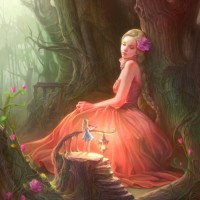 a fantastical scene with a girl who appears to be a fairy tale princess. She is wearing an elegant pink dress and has