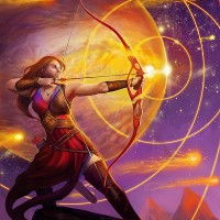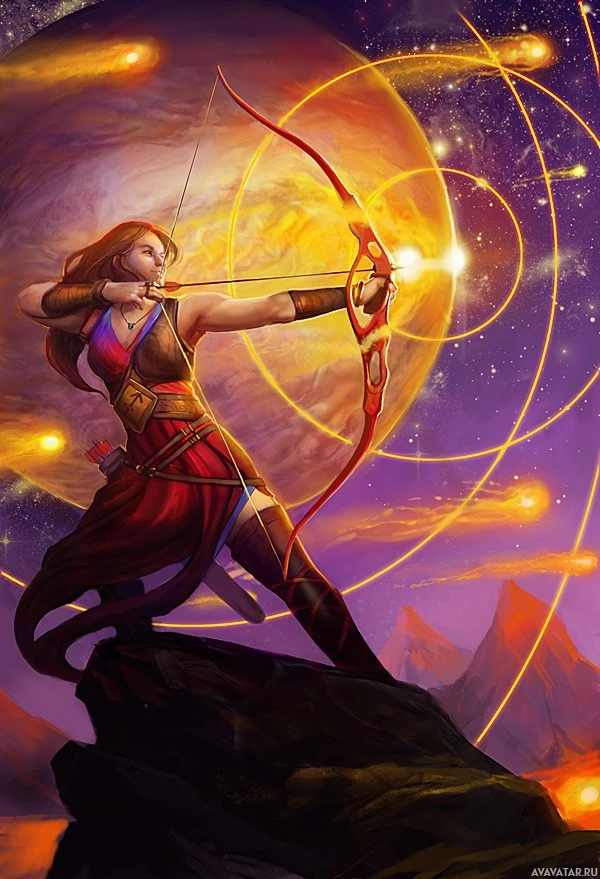 a female character with red hair, holding a bow and aiming at something. She is set against a cosmic background that features planets, stars, and energy or