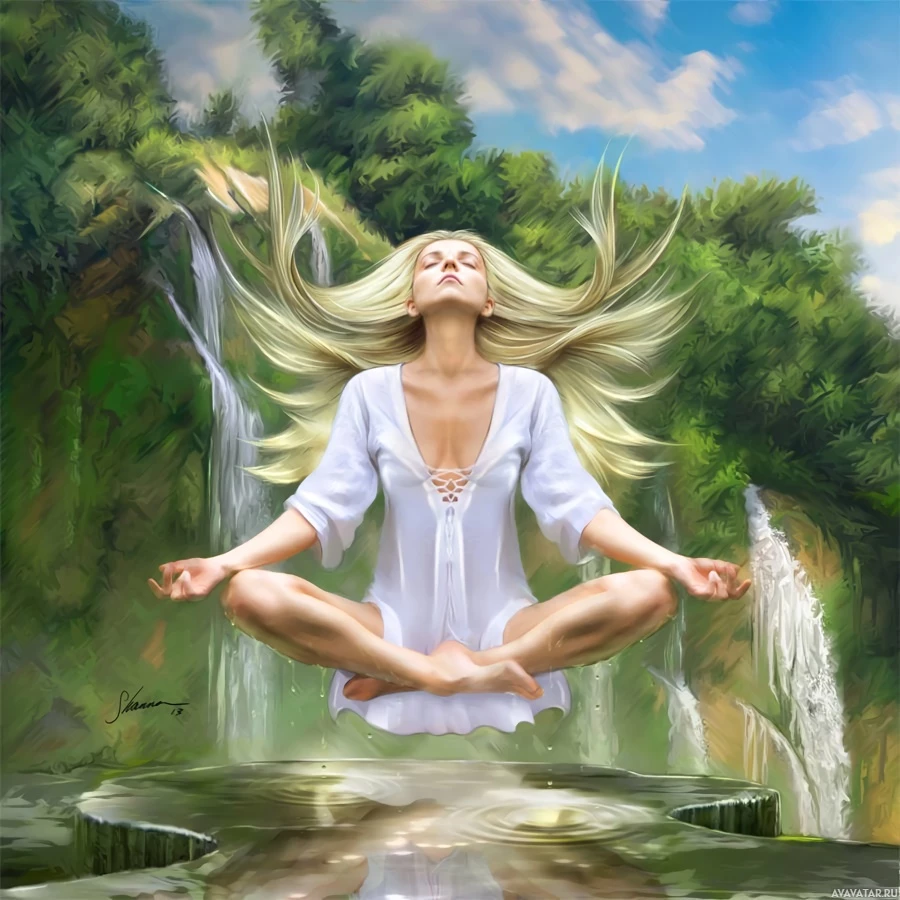 blonde hair in a serene pose, likely practicing yoga. She is seated cross-legged on what appears to be the edge of a waterfall or