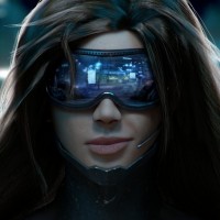 dark hair. The individual is set against a backdrop that suggests a high-tech environment, possibly from