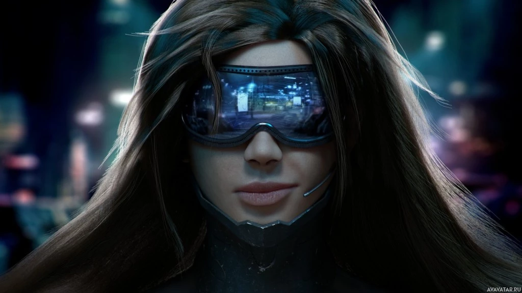 futuristic gear that includes a headset and what appears to be a visor or helmet with an interface on it. They are also wearing glasses and have