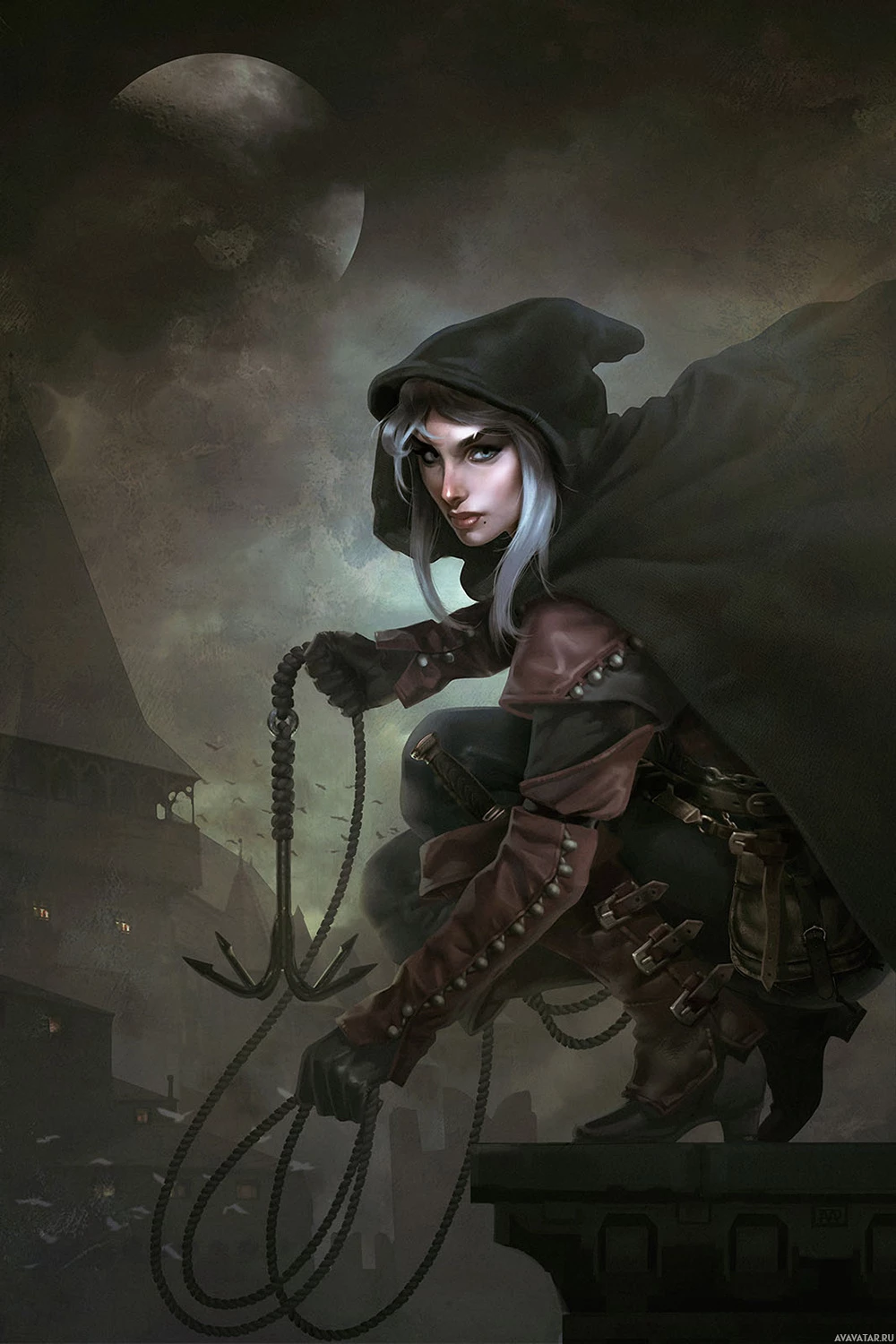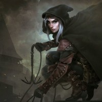 white hair and is wearing a hood, giving her an air of mystery or perhaps being on the run from danger. Her attire includes what appears to be a cloak or coat with
