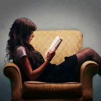The image shows a young woman sitting on a chair and reading a book. She is wearing a black dress and has long hair that falls over her shoulders. The lighting in the photo creates a dim atmosphere, suggesting that it might be an indoor setting.