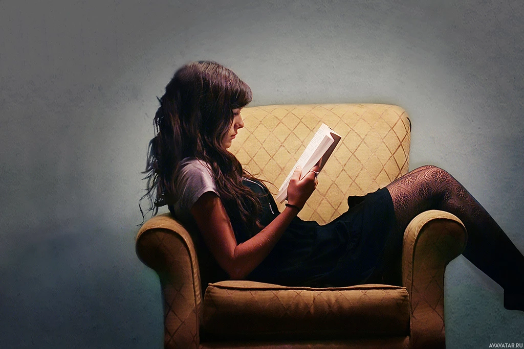 На снимке изображена молодая женщина, сидящая на стуле и читающая книгу. На ней черное платье и длинные волосы, которые падают на ее плечи. Освещение на фотографии создает тусклую атмосферу, предполагая, что это может быть обстановка в помещении.
