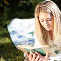 blonde hair and is wearing casual clothing suitable for a relaxed outdoor setting. The focus of the image is on her activity and enjoyment of the book, which suggests a peaceful and leisurely atmosphere.