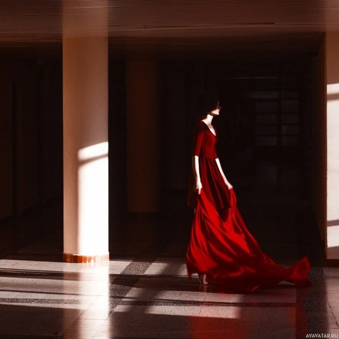 red dress that extends to the floor. She appears to be walking through an indoor space with architectural columns and what looks like sunlight streaming in, creating