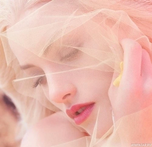 long hair and is wearing a garment or accessory that looks like a veil or a light mesh material around her head and shoulders. The background is softly blurred, which suggests a focus on the subject's face and expression.