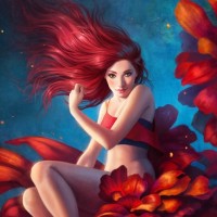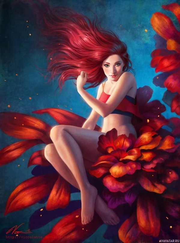 red hair, wearing a swimsuit. She is sitting among flowers, which are vibrant in color. The artwork features intricate details and a fantastical theme, with the flowers being part of her attire or environment rather than simply decorative elements around her.
