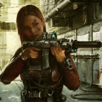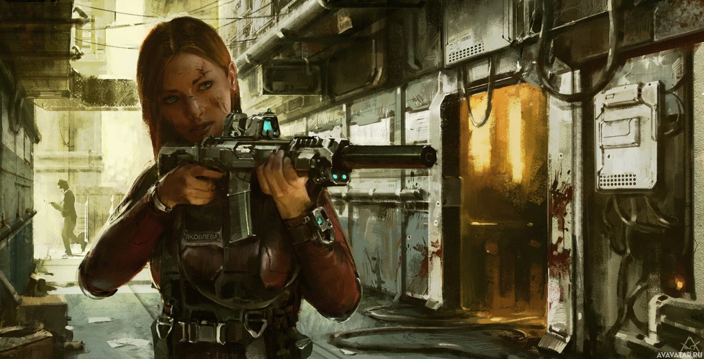 a female character holding a gun and looking directly at the viewer. She is inside what appears to be an industrial or laboratory