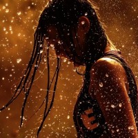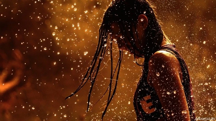 a young girl with long dark hair. She is looking downward and her expression seems contemplative or sorrowful. There are sparks flying around her head, which adds