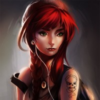 This is an illustration of a young woman with red hair. She appears to be wearing headphones, and there's a visible tattoo on her arm. Her attire suggests a casual or possibly urban style. The image does not include any text or additional context that would allow for further description or interpretation.