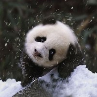 rocky terrain. The panda is surrounded by snow, which is being kicked up into the air by the panda's movement. The panda has its eyes open and seems to be looking directly at the camera, displaying a curious or inquisitive expression typical of these animals.