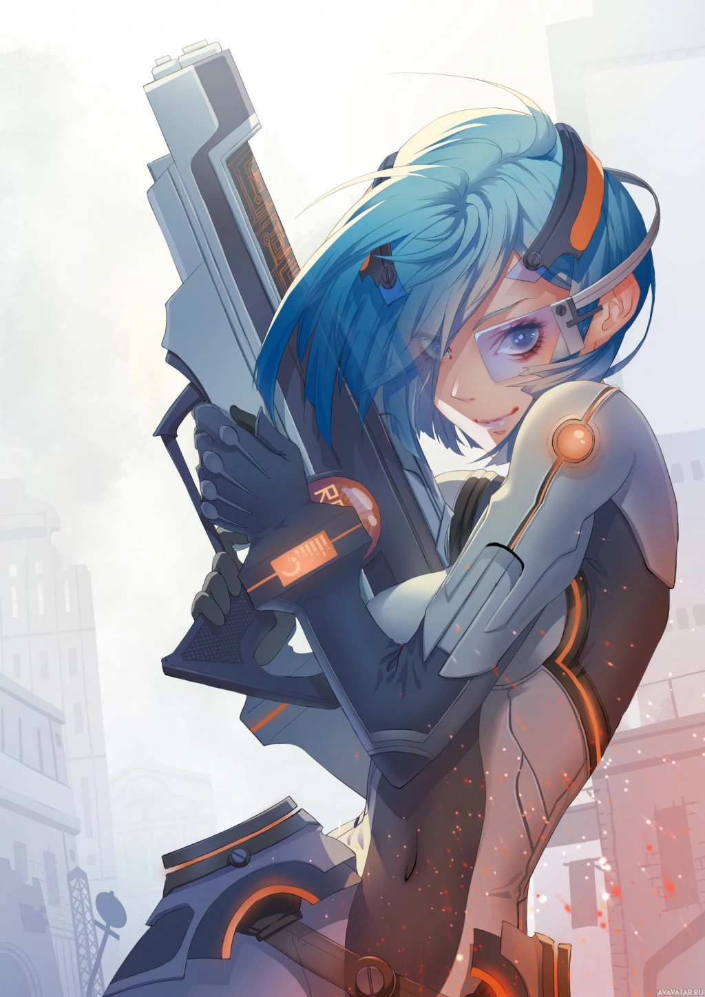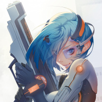 an animated character, a girl with blue hair, wearing what appears to be futuristic or cyberpunk-style armor. She is holding a weapon that resembles