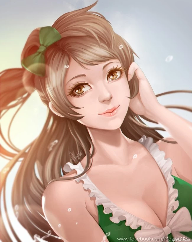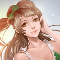 a female character with light-colored hair adorned with green ribbons, wearing what appears to be a traditional maid's outfit. She is smiling and looking down, possibly at her hand. The background has a soft,