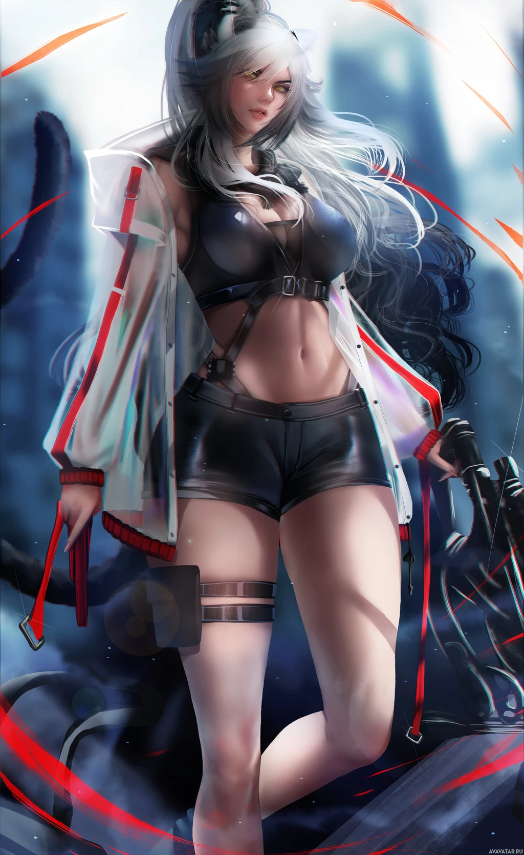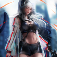 a female warrior or fighter. She has white hair and is wearing a combination of what looks like futuristic clothing with elements of armor, suggesting she may have a role in a game or story set in