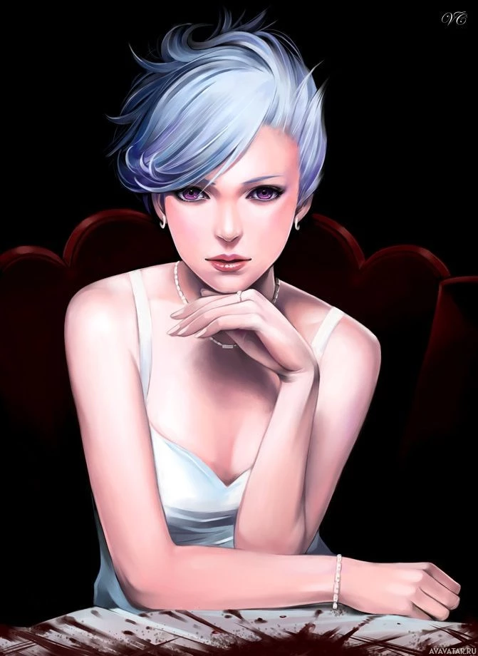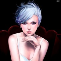 blue hair and a serious expression. She is depicted in