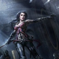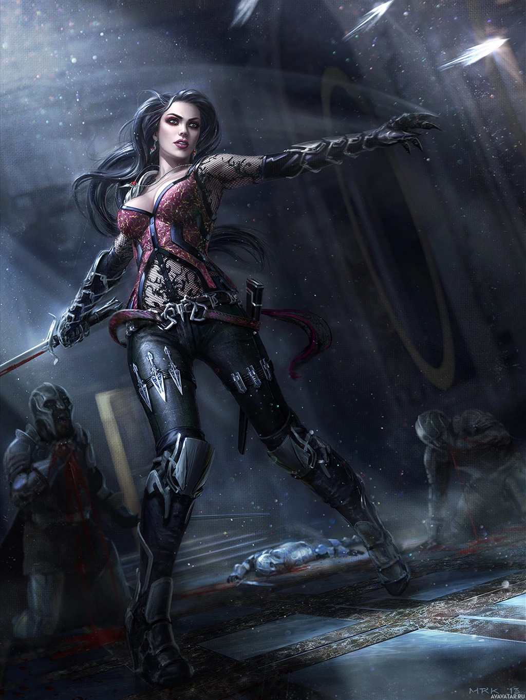 dark hair, is wearing a tight-fitting outfit with leather elements and intricate detailing, including what seems to be armor or protective gear. In her left hand, she holds