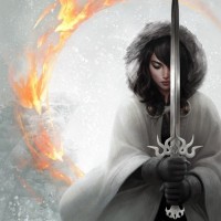 brunette hair. She is holding a sword in one hand and wearing a cloak or cape draped over her shoulders. The cloak has a hood, suggesting it might be cold or she's protecting her identity. The background suggests an icy or