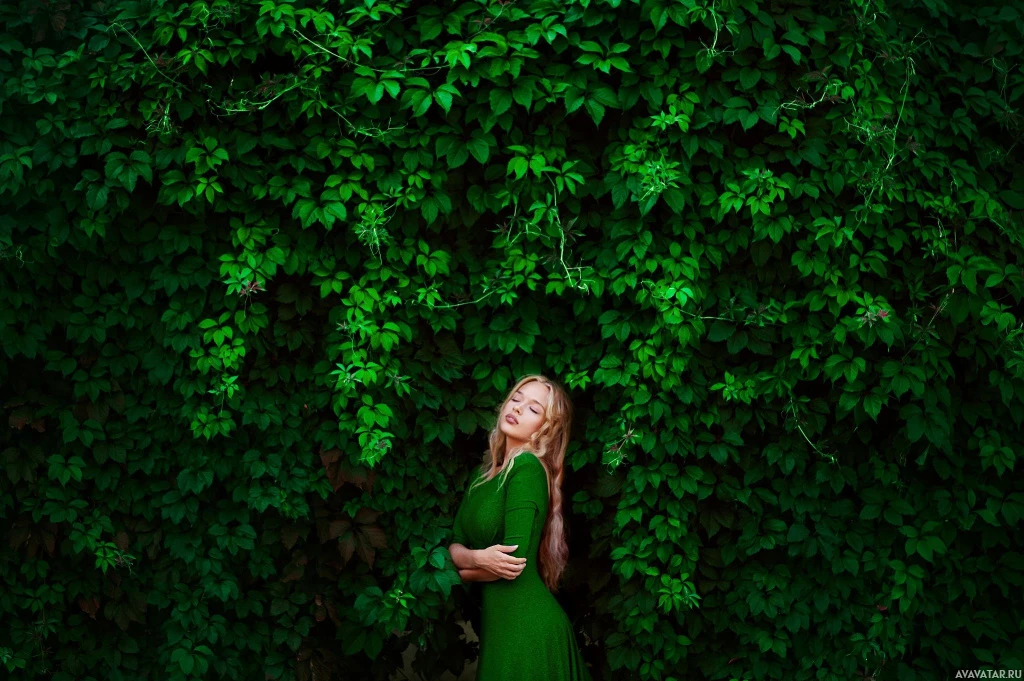a natural environment, possibly a woodland or garden, with dense foliage that obscures much of the background. It's a serene and peaceful scene, with the woman seemingly at ease in