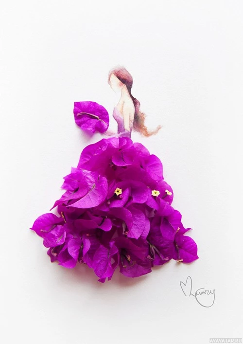 long hair, wearing a purple dress that has fallen to the ground. She is depicted mid-dance or in
