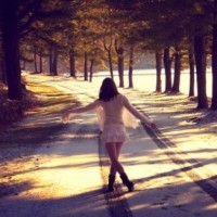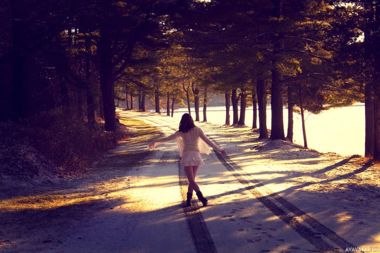 The image shows a person from behind, walking down a road or path. It appears to be wintertime, as suggested by the ground covered in snow and the shadows of trees indicating that the sun is low on the horizon, which often occurs during