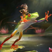 a fantasy scene with an anthropomorphic frog riding on another frog. Both frogs have