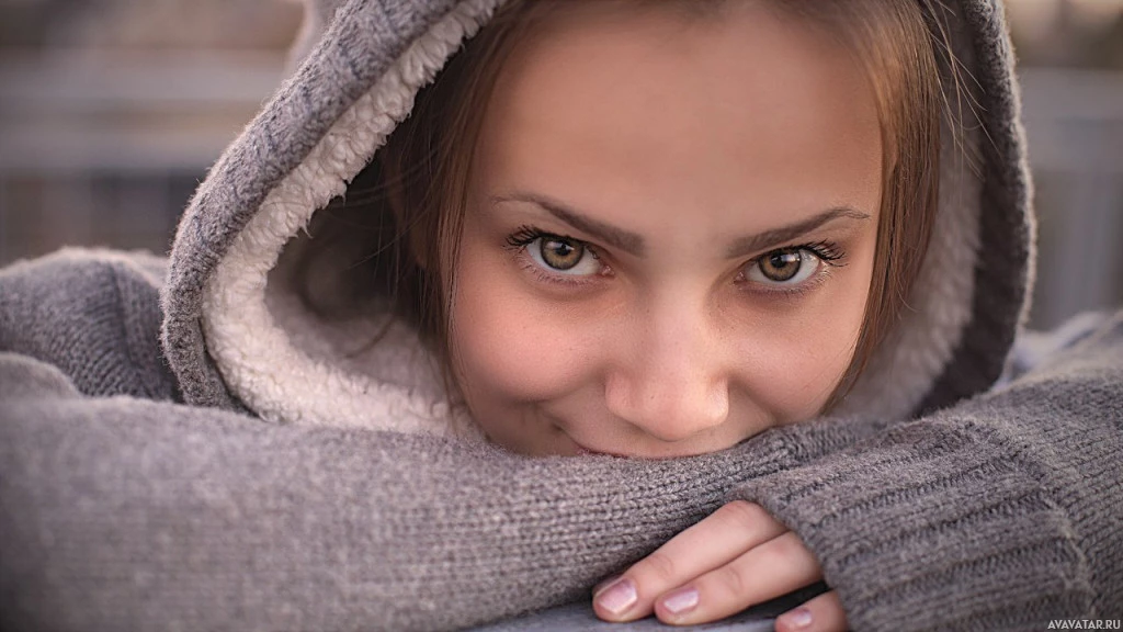 looking garment that could be a sweater or jacket. Her expression is one of contemplation or pensiveness. The background is out of focus but seems to be