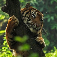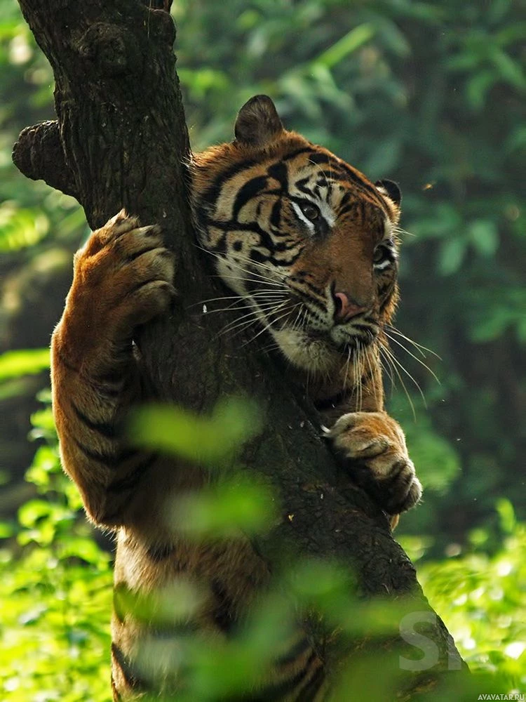 a tree branch, which could indicate curiosity or playfulness. Its fur pattern, facial features, and