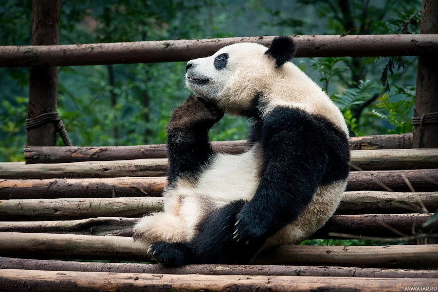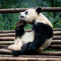 a wooden structure, possibly part of an enclosure designed for its comfort. The panda is looking off to the side with its hand resting on its head in