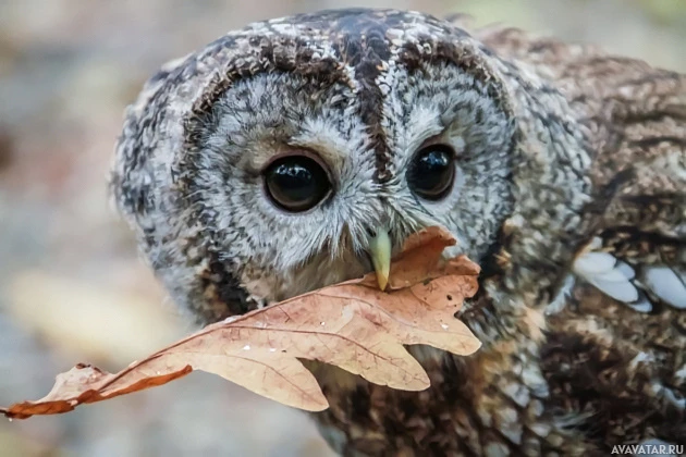 brown feathers marked with white and black patterns. The owl is holding a leaf in its beak, which suggests it might be using the leaf as part of its natural foraging behavior or engaging in