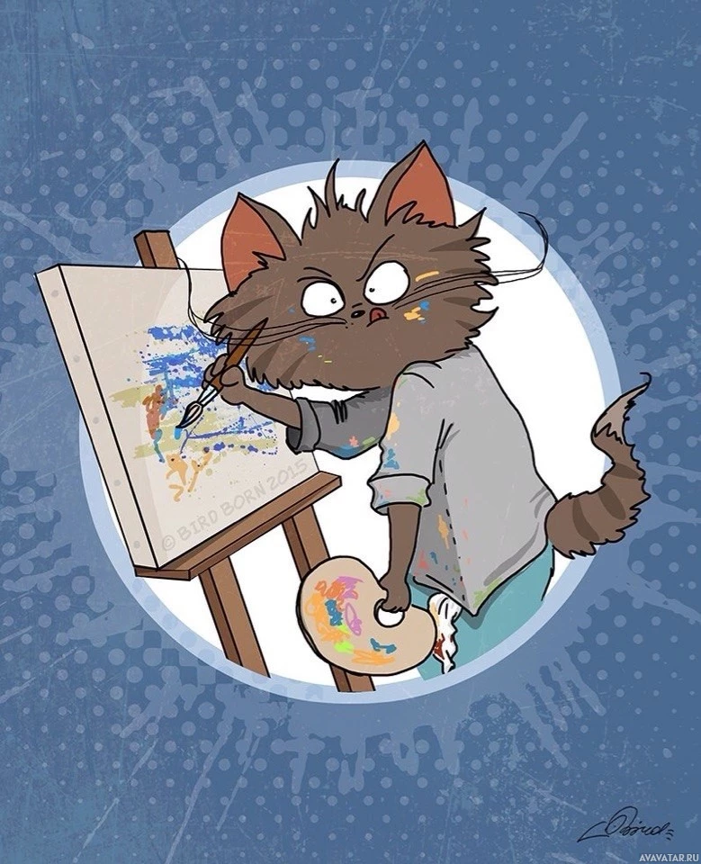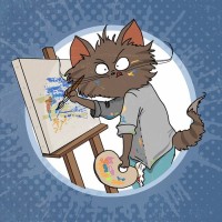 cat character engaged in painting. The cat is standing on a platform holding a paintbrush, with the paint splattered on its fur and face, indicating that it has been actively painting. There are also