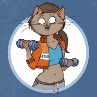 cat character. She has a surprised or slightly embarrassed expression and is holding two dumbbells in her hands, suggesting she is engaged in