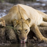 The image shows a lion resting with its paw on the ground and its head lowered to drink water from a pool of water. It appears to be in a natural environment, possibly a savanna or grassland habitat.